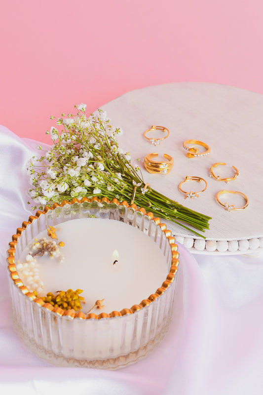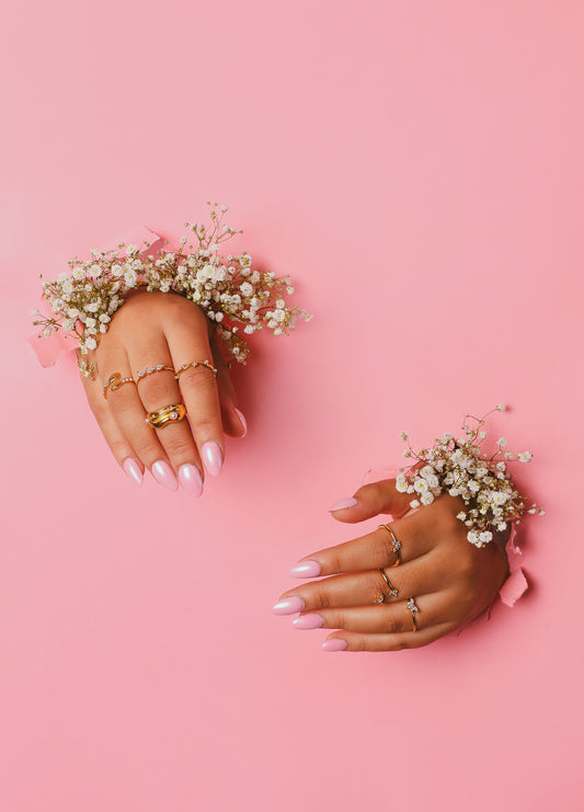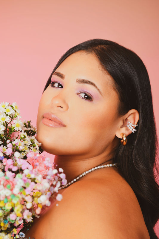 Pulseras flores + pulseras doradas y de perlas ajustables ($19)
