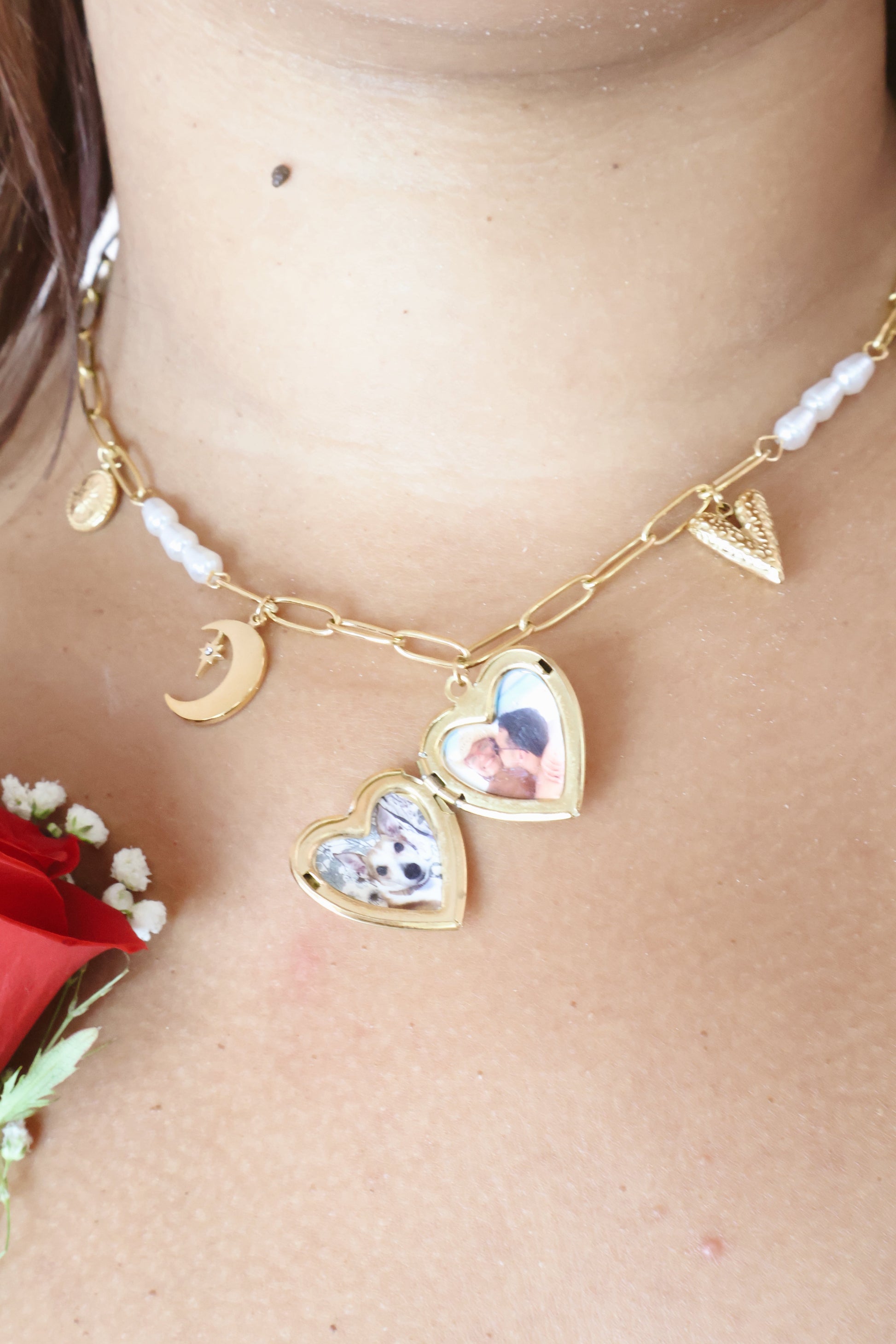 Ilumina tu amor con nuestro Alma Necklace, una pieza única de nuestra colección Lazos de Amor. Este diseño combina elegancia y personalización, con charms en forma de luna, corazón y detalles perlados que transmiten romance y conexión. Personaliza los relicarios en forma de corazón con fotos especiales que capturan tus momentos más preciados.